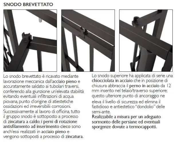 Una delle caratteristiche vincenti della grata Hercules è lo speciale SNODO BREVETTATO che permette una facile e fluida apertura sia interna che esterna delle ante, consentendo un agevole movimentazione delle persiane esterne.